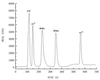 按表2的洗脱前提,进样20.0µg/L砷形状夹杂规范溶液,获得五种砷分手色谱图,如图2。AsC、As3+、DMA、MMA、As5+绝对保留时候别离为120s、155s、247s、329s、583s,总分手时候约为600s。