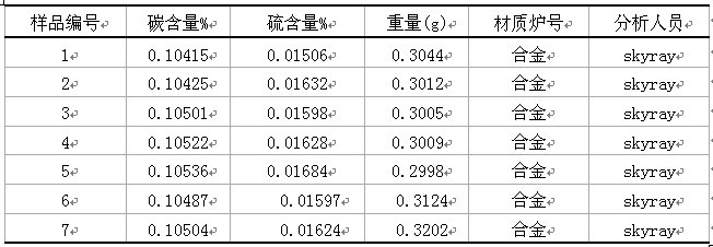 一合金材料国家标准下载GBW(E)010136-9901(C%:0.104,S%:0.015)用高频率红外碳硫仪168型测试英文结果下例: